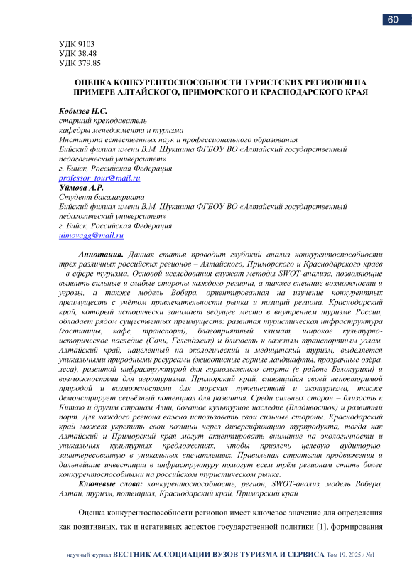 Данная статья проводит глубокий анализ конкурентоспособности трёх различных российских регионов – Алтайского, Приморского и Краснодарского краёв – в сфере туризма. Основой исследования служат методы SWOT-анализа, позволяющие выявить сильные и слабые стороны каждого региона, а также внешние возможности и угрозы, а также модель Вобера, ориентированная на изучение конкурентных преимуществ с учётом привлекательности рынка и позиций региона. Краснодарский край, который исторически занимает ведущее место в внутреннем туризме России, обладает рядом существенных преимуществ: развитая туристическая инфраструктура (гостиницы, кафе, транспорт), благоприятный климат, широкое культурно-историческое наследие (Сочи, Геленджик) и близость к важным транспортным узлам. Алтайский край, нацеленный на экологический и медицинский туризм, выделяется уникальными природными ресурсами (живописные горные ландшафты, прозрачные озёра, леса), развитой инфраструктурой для горнолыжного спорта (в районе Белокурихи) и возможностями для агротуризма. Приморский край, славящийся своей неповторимой природой и возможностями для морских путешествий и экотуризма, также демонстрирует серьёзный потенциал для развития. Среди сильных сторон – близость к Китаю и другим странам Азии, богатое культурное наследие (Владивосток) и развитый порт. Для каждого региона важно использовать свои сильные стороны. Краснодарский край может укрепить свои позиции через диверсификацию турпродукта, тогда как Алтайский и Приморский края могут акцентировать внимание на экологичности и уникальных культурных предложениях, чтобы привлечь целевую аудиторию, заинтересованную в уникальных впечатлениях. Правильная стратегия продвижения и дальнейшие инвестиции в инфраструктуру помогут всем трём регионам стать более конкурентоспособными на российском туристическом рынке.