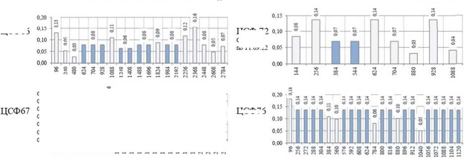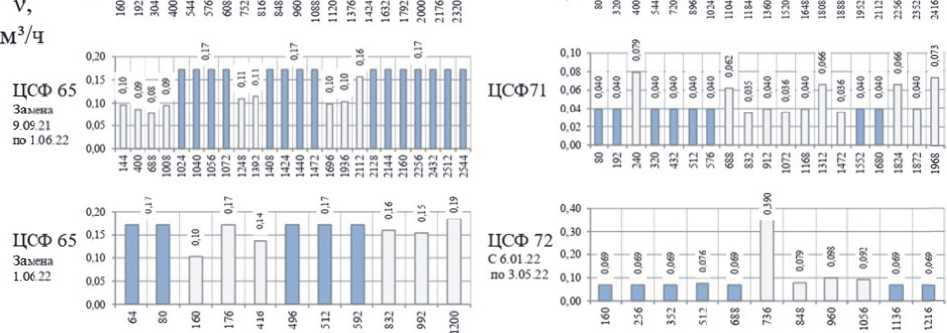 Для выявления характера изменения основных эксплуатационных показателей были использованы временные ряды варьирования часовой скорости потерь объемов v СиПС СОЖ в периодах между коррекциями на протяжении периода времени между заменами СОЖ (рисунок 5) v i . Установлено, что для всех ЦСФ (всех ТС) наблюдались как участки стабильности ( v = const), так и нестабильности ( v ^ const). Это наблюдение привело к пониманию возможности использования v (или v' ) для контроля и мониторинга качества процесса применения СОЖ, ЦСФ, а также системы более высокого уровня, характерной для варианта ТС. На рисунке 5 показаны изменения v для ЦСФ 13, 14, 23, 56, 63, 70, 72 и 76. Участки стабильности перемешаны с участками нестабильности. Данный метод является методом индикативного контроля уровней качества (стабильность) СОЖ, ЦСФ и производственной системы по ТС и в целом.