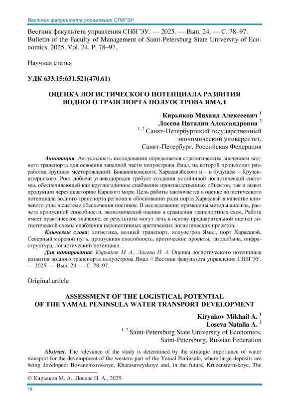 Актуальность исследования определяется стратегическим значением водного транспорта для освоения западной части полуострова Ямал, на которой происходит разработка крупных месторождений: Бованенковского, Харасавэйского и – в будущем – Крузенштернского. Рост добычи углеводородов требует создания устойчивой логистической системы, обеспечивающей как круглогодичное снабжение производственных объектов, так и вывоз продукции через акваторию Карского моря. Цель работы заключается в оценке логистического потенциала водного транспорта региона и обосновании роли порта Харасавэй в качестве ключевого узла в системе обеспечения поставок. В исследовании применены методы анализа, расчета пропускной способности, экономической оценки и сравнения транспортных схем. Работа имеет практическое значение, ее результаты могут лечь в основу предварительной оценки логистической схемы снабжения перспективных арктических логистических проектов.