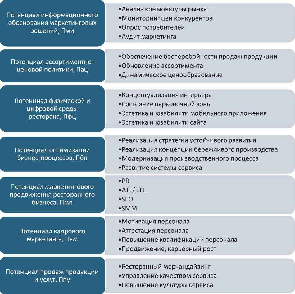 Маркетинговый потенциал предприятий ресторанного бизнеса следует оценивать с позиции полноты, качества и регулярности использования современного маркетингового инструментария, соответствующего новейшим трендам отрасли, учитывающего специфику применения в цифровом пространстве, стратегические ориентиры деятельности ресторанной компании на рынке услуг общественного питания.