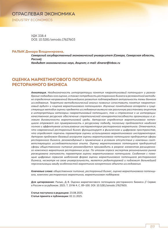 Неоднозначность интерпретации понятия «маркетинговый потенциал» и разнообразие подходов к его оценке, а также потребность ресторанного бизнеса в релевантной методике определения направлений дальнейшего развития подтверждают актуальность темы данного исследования. Теоретикометодологический анализ позволил сопоставить понятия «маркетинговый аудит» и «оценка маркетингового потенциала». Изучение понятийного аппарата и существующих методик оценки предмета исследования выявило как различную расстановку акцентов в интерпретации категории «маркетинговый потенциал», так и стремление к их интеграции: качественное ресурсное обеспечение стратегической конкурентоспособности организации в условиях динамичности маркетинговой среды. Авторское определение маркетингового потенциала отражает его приверженность к ресурсному подходу, поскольку предлагается наиболее полное и эффективное использование инструментария ресторанного маркетинга. Отмечается, что современный ресторанный бизнес функционирует в физическом и цифровом пространстве, что определяет перечень параметров оценки используемого маркетингового инструментария. Автором предложен базовый алгоритм оценки маркетингового потенциала предприятия сферы ресторанного бизнеса, рекомендуемый к применению в условиях отсутствия у компании соответствующего исследовательского опыта. Оценку маркетингового потенциала предприятий сферы общественного питания рекомендуется производить в разрезе элементов расширенного комплекса маркетинга ресторанных услуг. По итогам опроса экспертов регионального рынка ранжирована значимость параметров оценки маркетингового потенциала. Созданная с помощью цифровых сервисов шаблонная форма оценки маркетингового потенциала ресторанного бизнеса, несмотря на свою универсальность, является редактируемой и подлежит дальнейшей персонализации ввиду особенностей маркетинга конкретного объекта исследования.