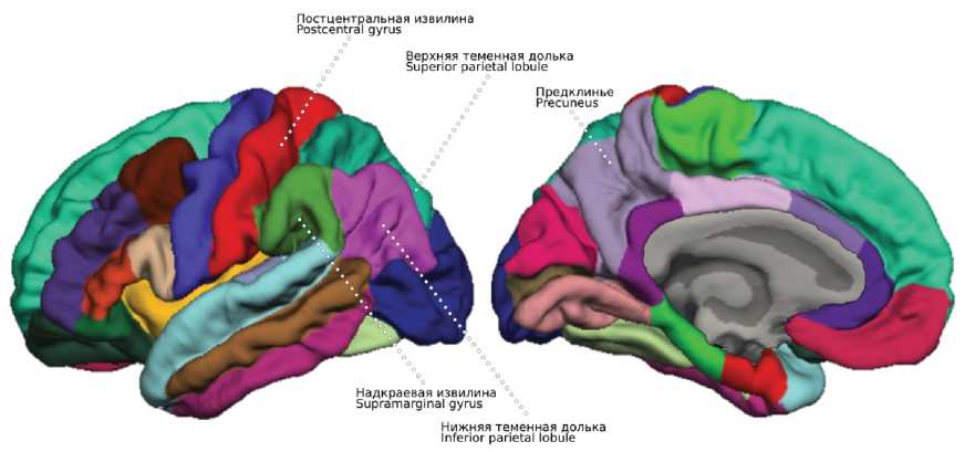 (FA) — 10°, FOV — 250 мм, матрица — 256×256, толщина среза — 1 мм, количество срезов — 160, время сканирования — 11 минут. Для морфометрического анализа структур головного мозга применялось программное обеспечении FreeSurfer версии 7.3.2 [19]. МР-морфометрия выполнена в автоматическом режиме, в ходе которой были определены морфометрические показатели (объёма в мм3, площади в мм2 и толщины в мм) для каждой структуры теменных долей, представленной на рисунке 1. Постпроцессинговая обработка данных проводилась поэтапно. Подготовительный этап включал линейное преобразование Талайраха, нормализацию интенсивности, удаление черепа и внемозговых тканей с помощью поверхностной деформации, отделение мозжечка и ствола мозга от головного мозга и разделение левого и правого полушарий [19]. Для выделения внутренних (серо‐белых) и пиальных (серо‐ликворных) поверхностей коры применялся алгоритм деформируемой поверхности [20]. Обработка также включала в себя топологическую коррекцию, сферизацию поверхности и регистрацию в сферическом атласе [21]. Парцелляция коры головного мозга выполнялась с использованием встроенного атласа (атлас Desikan-Killiany), разделивший кортикальную поверхность на области в каждом полушарии [22].