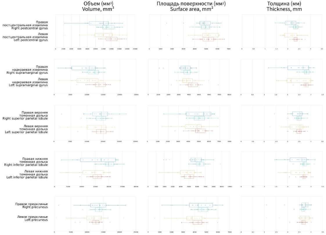 Половые различия. Сравнительный анализ гендерных различий объёма, площади поверхности и толщины коры теменных долей с учётом процентного соотношения этих морфометрических показателей к общему внутричерепному объёму не выявил статистически значимых различий между возрастными группами 0–7 и 7–18 лет (p>0,05). Тем не менее, у мальчиков обеих возрастных групп (0–7 и 7–18 лет) наблюдалась тенденция к большему объёму и площади поверхности в постцентральной и надкраевых извилинах с обеих сторон, а также в верхней и нижней теменных дольках справа по сравнению с девочками. В младшей возрастной группе толщина коры преимущественно была больше у мальчиков в надкраевых извилинах и нижних теменных дольках с обеих сторон по сравнению с девочками. В старшей возрастной группе у девочек наблюдалась тенденция к большей толщине коры в надкраевых извилинах с обеих сторон и левой постцентральной извилине, а также к более высоким показателям объёма, площади поверхности и толщины коры верхней теменной дольки, а также объёма и толщины коры предклинья с обеих сторон по сравнению с мальчиками. При этом площадь поверхности коры предклинья с обеих сторон была преимущественно больше у мальчиков.