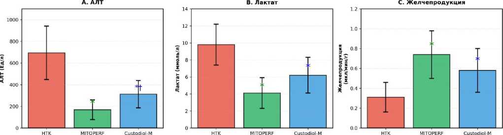 Важным аспектом полученных результатов является сохранение не только структурной целостности, но и функциональной активности органов после ишемии-реперфузии. Для печени продукция желчи — интегральный показатель, отражающий сохранность как гепатоцитов (секреция первичной желчи), так и холангиоцитов (модификация желчи в протоках). Достижение объёмной скорости желчеотделения 0,74 мкл/мин/г в группе MITOPERF, приближающейся к физиологическим значениям для ex vivo перфузии крысиной печени (0,8-1,2 мкл/мин/г), свидетельствует о полноценном восстановлении билиарной функции.