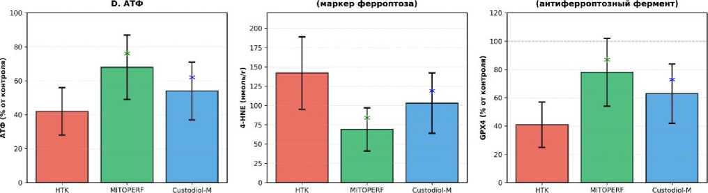плеции АТФ представляет точку необратимости повреждения, приводя к набуханию митохондрий, разрыву наружной мембраны и высвобождению проапоптотических факторов. Стабилизация mPTP объясняет не только снижение маркеров некроза (АЛТ, креатинин), но и сохранение функциональной активности органов — продукции желчи для печени (0,74 vs 0,31 мкл/мин/г) и скорости клубочковой фильтрации для почки (0,76 vs 0,24 мл/мин/г). Уникальной особенностью MITOPERF является включение антиферроптозного модуля, направленного на подавление железо-зависимого перекисного окисления липидов мембран. Ферроптоз — специфическая форма регулируемой клеточной гибели, индуцируемая накоплением липидных гидроперекисей в условиях дисфункции антиоксидантной системы глу-татион-GPX4 — играет критическую роль в повреждении холангиоцитов печени и эпителия проксимальных канальцев почки при ишемии-реперфузии (Friedmann Angeli et al., Nat Cell Biol 2014; Linkermann et al., PNAS 2014). Снижение концентрации 4-гидроксиноненаля (4-HNE) — специфического маркера перекисного окисления липидов — более чем в два раза (от 84,3 до 38,7 нмоль/г ткани) в группе MITOPERF по сравнению с контролем подтверждает эффективное подавление ферроптоза. Параллельное увеличение активности глутатионпероксидазы-4 (GPX4) почти вдвое (от 2,4 до 4,8 Ед/мг белка) указывает на восстановление ключевого ан-тиферроптозного фермента, единственного способного нейтрализовать фосфолипидные гидроперекиси непосредственно в клеточных мембранах. Механизм антиферроптозной защиты в составе MITOPERF реализуется двумя путями: 1) хелатированием лабильного железа Fe³⁺, что предотвращает реакцию Фентона и образование гидроксильных радикалов; 2) обеспечением кофактором глутатионпероксидазы-4 истощения глутатиона при ишемии.