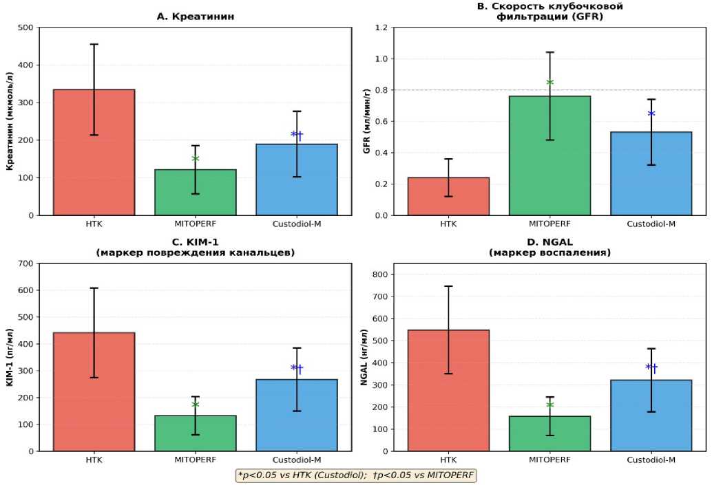 Примечание: * — p<0,05 по сравнению с группой Кустодиол (тест Манна–Уитни); † — p<0,05 по сравнению с группой MITOPERF. GFR — скорость клубочковой фильтрации, FENa — фракционная экскреция натрия, KIM-1 — Kidney Injury Molecule-1, NGAL — Neutrophil Gelatinase-Associated Lipocalin, ATN — острый канальцевый некроз.