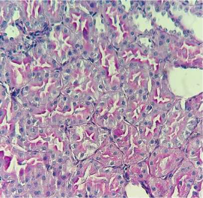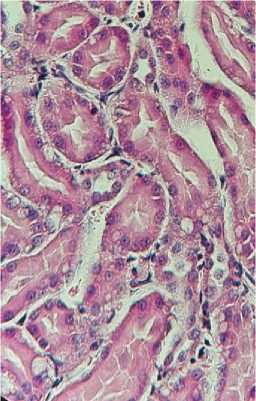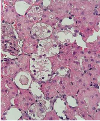 Рисунок 4. Гистологическая картина после реперфузии почек в эксперименте (гематоксилин-эозин, ×400): A. Острый канальцевый некроз, белковые цилиндры (перфузия Кустодиол). B. Очаговая вакуолизация, единичные цилиндры (перфузия Кустодиол-М). C. Сохранная щёточная кайма, минимальная вакуолизация (перфузия Митоперф)