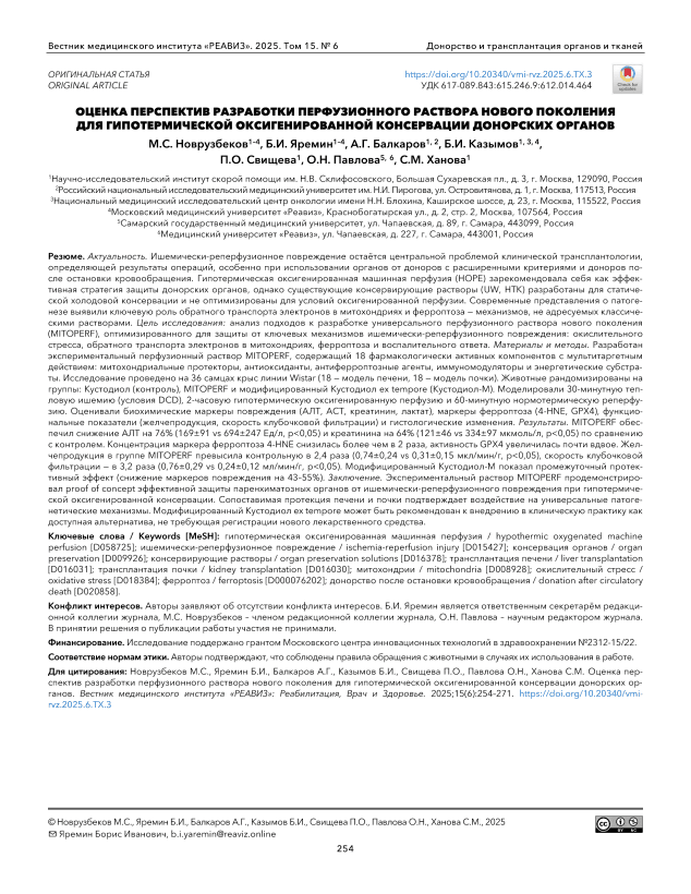 Актуальность. Ишемически-реперфузионное повреждение остаётся центральной проблемой клинической трансплантологии, определяющей результаты операций, особенно при использовании органов от доноров с расширенными критериями и доноров после остановки кровообращения. Гипотермическая оксигенированная машинная перфузия (HOPE) зарекомендовала себя как эффективная стратегия защиты донорских органов, однако существующие консервирующие растворы (UW, HTK) разработаны для статической холодовой консервации и не оптимизированы для условий оксигенированной перфузии. Современные представления о патогенезе выявили ключевую роль обратного транспорта электронов в митохондриях и ферроптоза — механизмов, не адресуемых классическими растворами. Цель исследования: анализ подходов к разработке универсального перфузионного раствора нового поколения (MITOPERF), оптимизированного для защиты от ключевых механизмов ишемически-реперфузионного повреждения: окислительного стресса, обратного транспорта электронов в митохондриях, ферроптоза и воспалительного ответа. Материалы и методы. Разработан экспериментальный перфузионный раствор MITOPERF, содержащий 18 фармакологически активных компонентов с мультитаргетным действием: митохондриальные протекторы, антиоксиданты, антиферроптозные агенты, иммуномодуляторы и энергетические субстраты. Исследование проведено на 36 самцах крыс линии Wistar (18 — модель печени, 18 — модель почки). Животные рандомизированы на группы: Кустодиол (контроль), MITOPERF и модифицированный Кустодиол ex tempore (Кустодиол-М). Моделировали 30-минутную тепловую ишемию (условия DCD), 2-часовую гипотермическую оксигенированную перфузию и 60-минутную нормотермическую реперфузию. Оценивали биохимические маркеры повреждения (АЛТ, АСТ, креатинин, лактат), маркеры ферроптоза (4-HNE, GPX4), функциональные показатели (желчепродукция, скорость клубочковой фильтрации) и гистологические изменения. Результаты. MITOPERF обеспечил снижение АЛТ на 76% (169±91 vs 694±247 Ед/л, p<0,05) и креатинина на 64% (121±46 vs 334±97 мкмоль/л, p<0,05) по сравнению с контролем. Концентрация маркера ферроптоза 4-HNE снизилась более чем в 2 раза, активность GPX4 увеличилась почти вдвое. Желчепродукция в группе MITOPERF превысила контрольную в 2,4 раза (0,74±0,24 vs 0,31±0,15 мкл/мин/г, p<0,05), скорость клубочковой фильтрации — в 3,2 раза (0,76±0,29 vs 0,24±0,12 мл/мин/г, p<0,05). Модифицированный Кустодиол-М показал промежуточный протективный эффект (снижение маркеров повреждения на 43–55%). Заключение. Экспериментальный раствор MITOPERF продемонстрировал proof of concept эффективной защиты паренхиматозных органов от ишемически-реперфузионного повреждения при гипотермической оксигенированной консервации. Сопоставимая протекция печени и почки подтверждает воздействие на универсальные патогенетические механизмы. Модифицированный Кустодиол ex tempore может быть рекомендован к внедрению в клиническую практику как доступная альтернатива, не требующая регистрации нового лекарственного средства.