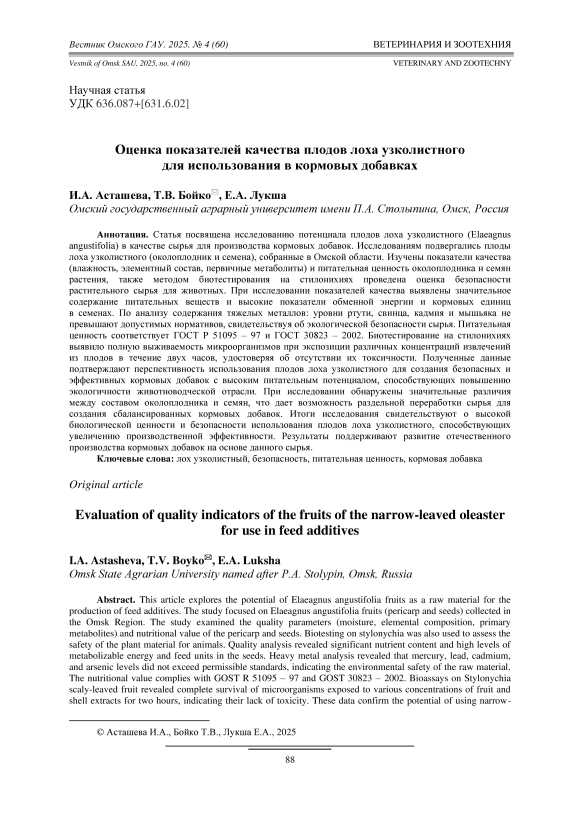 Статья посвящена исследованию потенциала плодов лоха узколистного (Elaeagnus angustifolia) в качестве сырья для производства кормовых добавок. Исследованиям подвергались плоды лоха узколистного (околоплодник и семена), собранные в Омской области. Изучены показатели качества (влажность, элементный состав, первичные метаболиты) и питательная ценность околоплодника и семян растения, также методом биотестирования на стилонихиях проведена оценка безопасности растительного сырья для животных. При исследовании показателей качества выявлены значительное содержание питательных веществ и высокие показатели обменной энергии и кормовых единиц в семенах. По анализу содержания тяжелых металлов: уровни ртути, свинца, кадмия и мышьяка не превышают допустимых нормативов, свидетельствуя об экологической безопасности сырья. Питательная ценность соответствует ГОСТ Р 51095 – 97 и ГОСТ 30823 – 2002. Биотестирование на стилонихиях выявило полную выживаемость микроорганизмов при экспозиции различных концентраций извлечений из плодов в течение двух часов, удостоверяя об отсутствии их токсичности. Полученные данные подтверждают перспективность использования плодов лоха узколистного для создания безопасных и эффективных кормовых добавок с высоким питательным потенциалом, способствующих повышению экологичности животноводческой отрасли. При исследовании обнаружены значительные различия между составом околоплодника и семян, что дает возможность раздельной переработки сырья для создания сбалансированных кормовых добавок. Итоги исследования свидетельствуют о высокой биологической ценности и безопасности использования плодов лоха узколистного, способствующих увеличению производственной эффективности. Результаты поддерживают развитие отечественного производства кормовых добавок на основе данного сырья.