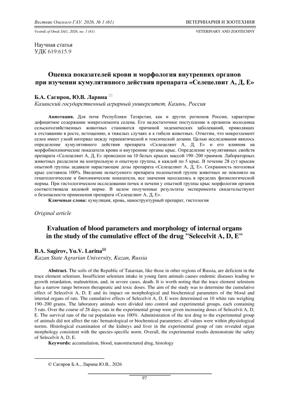 Для почв Республики Татарстан, как и других регионов России, характерно дефицитное содержание микроэлемента селена. Его недостаточное поступление в организм молодняка сельскохозяйственных животных становится причиной эндемических заболеваний, приводящих к отставанию в росте, истощению, в тяжелых случаях и к гибели животных. Отметим, что микроэлемент селен имеет узкий интервал между терапевтической и токсической дозами. Целью исследования явилось определение кумулятивного действия препарата «Селецелвит А, Д, Е» и его влияния на морфобиохимические показатели крови и внутренние органы крыс. Определение кумулятивных свойств препарата «Селецелвит А, Д, Е» проводили на 10 белых крысах массой 190–200 граммов. Лабораторных животных разделили на контрольную и опытную группы, в каждой по 5 крыс. В течение 28 сут крысам опытной группы задавали нарастающие дозы препарата «Селецелвит А, Д, Е». Сохранность поголовья крыс составила 100%. Введение испытуемого препарата подопытной группе животных не повлияло на гематологические и биохимические показатели, все значения находились в пределах физиологической нормы. При гистологическом исследовании почек и печени у опытной группы крыс морфология органов соответствовала видовой норме. В целом полученные результаты эксперимента свидетельствуют о безопасности применения препарата «Селецелвит А, Д, Е».