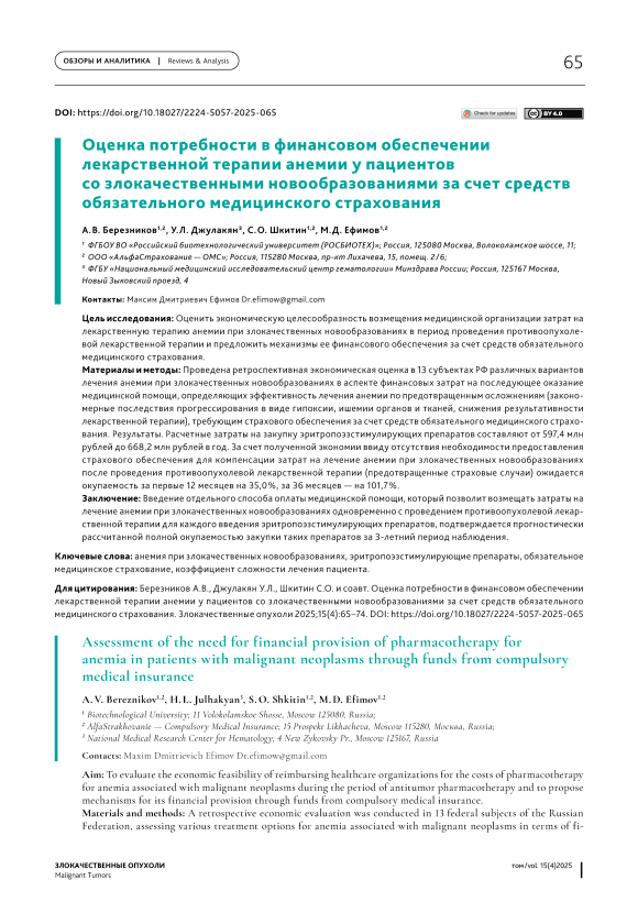 Оценка потребности в финансовом обеспечении лекарственной терапии анемии у пациентов со злокачественными новообразованиями за счет средств обязательного медицинского страхования