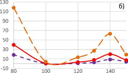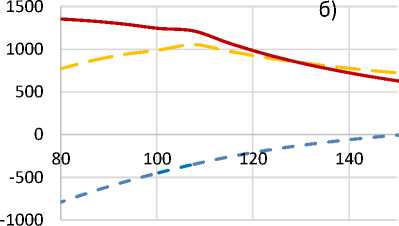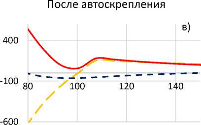 Сопоставляя приведенные на рисунке 1 а) и рисунке 1, г) графические зависимости, видим очевидные различия как в характере изменения напряжений по толщине стенки (по радиусу трубы), так и в амплитудных значениях напряжений. Отметим, что наибольшие амплитудные значения напряжений в автоскреплен-ной трубе достигаются не вблизи канала трубы, а в сечениях, находящихся в глубине стенки, что представляет меньшую опасность ее разрушения. Причем наибольшие значения интенсивностей напряжений значительно уменьшились с 899 МПа до 659 МПа, также сместившись при этом в глубину стенки. В самых опасных сечениях вблизи внутренней поверхности трубы – с 899 МПа до 334 МПа.