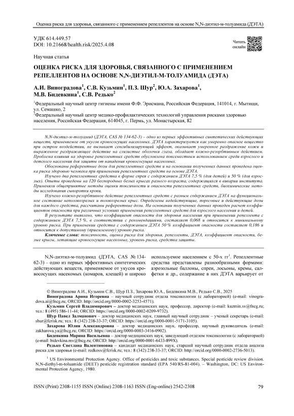 N,N-диэтил-м-толуамид (ДЭТА, CAS № 134-62-3) – одно из первых эффективных синтетических действующих веществ, применяемое от укусов кровососущих насекомых. ДЭТА характеризуется как умеренно опасное вещество при остром воздействии, не вызывает сенсибилизирующий эффект, оказывает умеренное раздражение кожи и выраженное раздражающее действие на слизистые оболочки глаза, обладает кожно-резорбтивным действием. Проблема влияния на здоровье репеллентных средств обусловлена повсеместным использованием среди взрослого и детского населения для защиты от нападения кровососущих насекомых. Обоснованы референтные дозы для репеллентных средств и на основании полученных данных проведена оценка риска здоровью человека при применении репеллентных средств на основе ДЭТА. Изучено два репеллентных средства в форме спрея с содержанием ДЭТА 7,5 % (для детей) и 50 % (для взрослых). Опыты проведены на 120 беспородных белых крысах разного возраста, содержащихся в виварии института. Применяли общепринятые методы оценки токсичности и опасности репеллентных средств, биохимические методы исследования сыворотки крови. Изучено кожно-резорбтивное действие репеллентных средств с разным содержанием ДЭТА на функциональное состояние неполовозрелых и половозрелых крыс. Определены недействующие, пороговые и действующие дозы для каждого средства, рассчитаны референтные дозы. На основании полученных данных проведен расчет коэффициентов опасности при различных условиях применения репеллентных средств для взрослого населения и детей. В результате выявлено, что коэффициент опасности для здоровья населения при применении репеллента с содержанием ДЭТА 7,5 %, в соответствии с рекомендациями, составляет 0,068 и относится к минимальному уровню риска. При применении средства с содержанием ДЭТА 50 % коэффициент опасности составляет 0,186 и относится к допустимому (приемлемому) уровню риска.