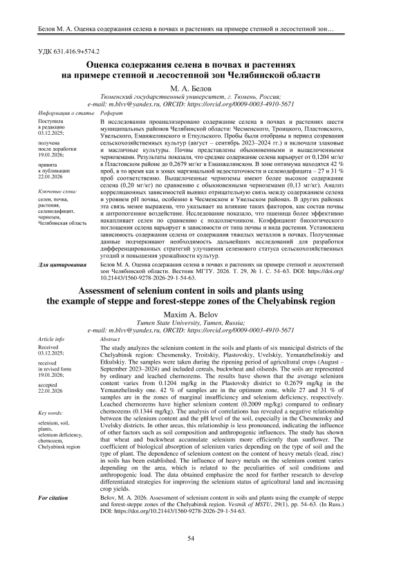 В исследовании проанализировано содержание селена в почвах и растениях шести муниципальных районов Челябинской области: Чесменского, Троицкого, Пластовского, Увельского, Еманжелинского и Еткульского. Пробы были отобраны в период созревания сельскохозяйственных культур (август – сентябрь 2023–2024 гг.) и включали злаковые и масличные культуры. Почвы представлены обыкновенными и выщелоченными черноземами. Результаты показали, что среднее содержание селена варьирует от 0,1204 мг/кг в Пластовском районе до 0,2679 мг/кг в Еманжелинском. В зоне оптимума находятся 42 % проб, в то время как в зонах маргинальной недостаточности и селенодефицита – 27 и 31 % проб соответственно. Выщелоченные черноземы имеют более высокое содержание селена (0,20 мг/кг) по сравнению с обыкновенными черноземами (0,13 мг/кг). Анализ корреляционных зависимостей выявил отрицательную связь между содержанием селена и уровнем pH почвы, особенно в Чесменском и Увельском районах. В других районах эта связь менее выражена, что указывает на влияние таких факторов, как состав почвы и антропогенное воздействие. Исследование показало, что пшеница более эффективно накапливает селен по сравнению с подсолнечником. Коэффициент биологического поглощения селена варьирует в зависимости от типа почвы и вида растения. Установлена зависимость содержания селена от содержания тяжелых металлов в почвах. Полученные данные подчеркивают необходимость дальнейших исследований для разработки дифференцированных стратегий улучшения селенового статуса сельскохозяйственных угодий и повышения урожайности культур.