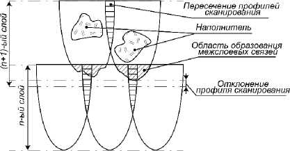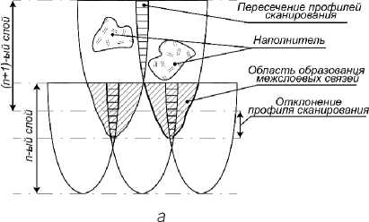 Наличие наполнителя в объеме распределения световой энергии пучка лазера может приводить к его деформированию и, как следствие, к нарушению областей пересечения. Изменение профиля сканирования описывается законами оптики, применимыми к световому потоку, проходящему через объем вещества, с применением закона Бугера-Ламберта-Бера, и обуславливается химическим взаимодействием компонентов с энергетическим потоком, его поглощением или отражательной способностью частицы. Исходя из этого можно представить гипотезу о причинах и внешнем виде формы распределения световой энергии при сканировании композиционного фотополимерного материала в объеме слоев (рисунок 6). Подобные исследования процессов рассеяния для наполненных систем также отражены в работе (Zhang, Jiang and Sun, 1999).