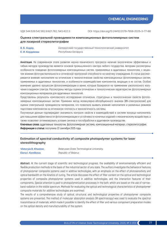 На современном этапе развития научно-технического прогресса наличие экологически эффективных и гибких методов производства является основой промышленного сектора любого государства. Авторами рассмотрены особенности поведения фотополимерных композиционных систем, применяемых в аддитивных технологиях, с акцентом влияния фоточувствительности и оптической пропускной способности на кинетику отверждения. В статье рассматривается влияние наполнителя на оптические и технологические свойства композиционных фотополимерных систем, применяемых в аддитивных технологиях, и особенности взаимодействия компонентов, входящих в их состав. Особое внимание уделено процессам фотополимеризации в ванне, которые базируются на применении узкополосного излучения в видимом спектре. Рассмотрены методы оценки оптических и технологических характеристик фотополимерных композиционных материалов для аддитивных технологий. Представлены результаты комплексного исследования оптических, структурных и технологических свойств фотополимерных композиционных систем. Применен метод молекулярно-абсорбционного анализа (ИК-спектроскопия) для оценки спектральной проводимости материалов, что позволило выявить влияние наполнителя и различных режимов подготовки компонентов на оптическую плотность и технологичность системы. Полученные данные подтверждают значимость контроля свойств и взаимодействий в системе матрица–наполнитель для повышения эффективности фотополимеризации и устойчивости конечных изделий к механическому воздействую, а также позволяют оптимизировать условия синтеза и постобработки в аддитивном производстве.