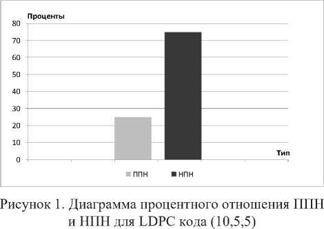 Подобный подход позволяет избежать метода перебора в процедуре поиска линейно независимого столбца для устранения свойства вырожденности переставленной матрицы. Это положительно сказывается не только на вре- менных показателях работы декодера в сторону их снижения. При этом повышается показатель ППН, например, для кода (15,5,7) он становится равным 90%. Подобную тенденцию в процентном соотношении показателей ППН и НПН повторяют коды Голея, но совершенно иная картина возникает при исследовании кодов с малой плотностью проверок на четность или хорошо известных кодовых конструкций с аббревиатурой LDPC.