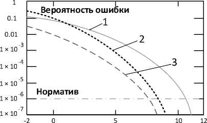 Использование алгоритма с исправлением одной ошибки, характерного для данного кода, представляется на графике зависимостью с номером 2 и оценивается выражением (3), показывая изменение вероятности ошибки на комбинацию. Используя выражение (4) получаем характеристику 3 вероятности ошибки на бит в условиях исправления одной ошибки. В этом случае сравнение зависимостей 1 и 3 представляется корректным. Характеристика 3 пересекает нормативную прямую в точке с аргументом 8,0 дБ, что указывает на ЭВК кода, равный 2,5 дБ.