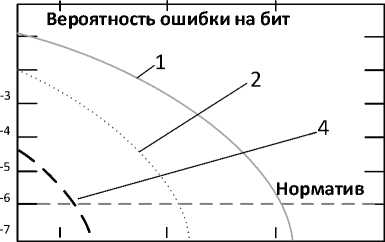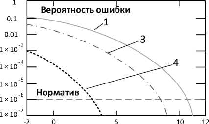 В случае использования процедуры коррекции значений НПН энергетические затраты на бит системы связи составят Eb ( 7,4,3 ) = 1 , которые будут обеспечиваться за счет внутренней работы декодера по коррекции перестановок НПН. На рисунке 2 представлены характеристики системы связи с помехоустойчивым кодированием при использовании двоичного кода (7,4,3) в условиях действия АБГШ. Характеристика с номером 1 представляет вероятность ошибки на бит без использования процедуры исправления ошибок, определяемой с использованием выражения (2). Нормативную прямую данная зависимость пересекает в точке с аргументом, равным 10,5 дБ.
