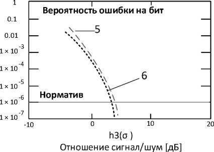 Вызывает интерес явление, которое возникает при обработке данных в системе ПД при гипотетическом повторе 20% данных и снижении при этом равнозначного значения параметра E b до 0,83. На рисунке 4 представлены две характеристики 5 и 6.