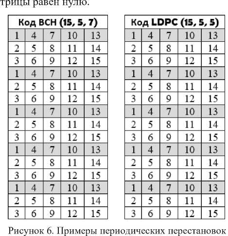 Изучение тонкой структуры ППН и НПН для различных кодов выявило ряд их особенностей, которые потребовали внести изменения в основной алгоритм ПД. Экспериментально было установлено, что в условиях, когда значение n оказывалось кратным значению k , то в условиях равных значений интервалов между нумераторами невозможно указать однозначно структуру порождающей матрицы эквивалентного кода. На рисунке 6 показаны примеры периодических перестановок для двух кодов, причем для кода ВСН определитель переставленной матрицы не равен нулю, а для кода LDPC определитель такой ма-