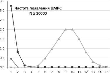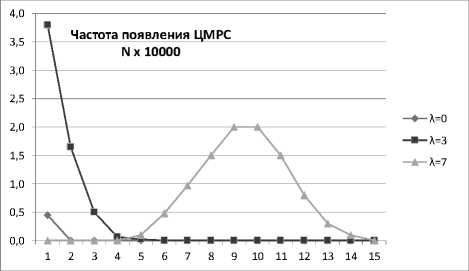 где A ( Z i ) - целочисленное мягкое решение сигнала (ЦМРС) его текущего значения Z i . В выражении (5) параметр A max обычно принимают равным семи [1; 8]. Тогда потребуется всего три бита для нумерации 8 значений ЦМРС от 0 до 7. Для выявления частоты формирования названных ЦМРС в канале с АБГШ была разработана имитационная модель подобного канала связи. Результаты испытаний модели и объем выборки приведены на рисунках 7 и 8.