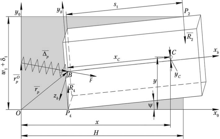 Рис. 1. Положение наноспутника (НС) в транспортно-пусковом контейнере (ТПК) (горизонтальная проекция): Ox 0 y 0 z 0 — жёстко связанная с ТПК система координат (СК); Bxbybzb — базовая СК; rp — радиус-вектор точки B в СК Ox 0 y 0 z 0 ; rpO — радиус-вектор крепления пружины в СК Ox 0 y 0 z 0 ; ψ — угол между проекцией продольной оси НС на плоскость ТПК Ox 0 y 0 и осью Ox 0 ; х, у — координаты ЦМ НС в СК Ox 0 y 0 z 0 ; С — центр масс (ЦМ) НС; xC — смещение ЦМ НС относительно задней торцевой части по оси х; yC — смещение ЦМ НС относительно его геометрического центра по оси y; w 1 — поперечный размер –НС; δ1 — величина зазора между Н–С и направляющими ТПК; Н — длина ТПК; F –— с–ила пружинного толкателя; Δ p — вектор перемещения платформы толкателя; R 2 , R 4 — силы реакции, действующие на НС со стороны направляющих ТПК; P 2 , P 4 — точки контакта НС с направляющими ТПК; s 1 — расстояние от точки контакта P 2 до оси yb (рисунок создан авторами)