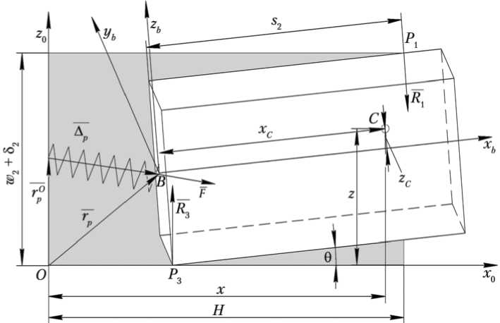 Рис. 2. Положение наноспутника (НС) в транспортно-пусковом контейнере (ТПК) (фронтальная проекция): Ox 0 y 0 z 0 — жёстко связанная с ТПК система координат (СК); Bxbybzb — базовая СК; rp — радиус-вектор точки B в СК Ox 0 y 0 z 0 ; rpO — радиус-вектор крепления пружины в СК Ox 0 y 0 z 0 ; θ — угол между проекцией продольной оси НС на плоскость ТПК Ox 0 z 0 и осью Ox 0 ; х, z — координаты центра масс (ЦМ) НС в СК Ox 0 y 0 z 0 ; С — ЦМ НС; xC — смещение ЦМ НС относительно задней торцевой части по оси х; zC — смещение ЦМ НС относительно его геометрического центра по оси z; w 2 — поперечный размер НС; δ2 — величина зазора между НС и направляющими ТПК; Н — длина ТПК; F — сила пружинного толкателя; Δ p — вектор перемещения платформы толкателя; R 1 , R 3 — силы реакции, действующие на НС со стороны направляющих ТПК; P 1 , P 3 — точки контакта НС с направляющими ТПК; s 2 — расстояние от точки контакта P 1 до оси zb (рисунок создан авторами)