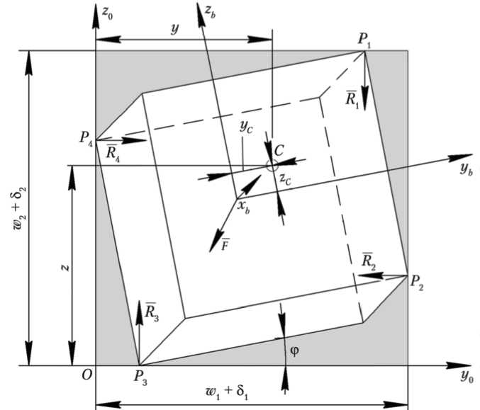 Рис. 3. Положение наноспутника (НС) в транспортно-пусковом контейнере (ТПК) (профильная проекция): Ox 0 y 0 z 0 — жёстко связанная с ТПК система координат (СК); Bxbybzb — базовая СК; ϕ — угол собственного вращения НС; х, у, z — координаты центра масс (ЦМ) НС в СК Ox 0 y 0 z 0 ; С — координата ЦМ НС; yC, zC — смещения ЦМ НС относительно его геометрического центра по осям y и z соответственно; w 1 , w 2 — поперечные размеры НС; δ1 , δ2 — величины зазоров между НС и направляющими ТПК; F — сила пружинного толкателя; Δ p — вектор перемещения платформы толкателя; R 1 , R 2 , R 3 , R 4 — силы реакции, действующие на НС со стороны направляющих ТПК; P 1 , P 2 , P 3 , P 4 — точки контакта НС с направляющими ТПК (рисунок создан авторами)