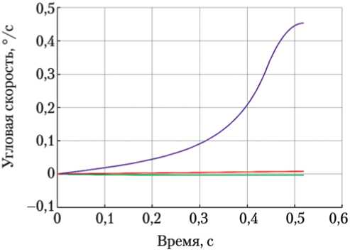 Рис. 4. Изменение угловой скорости наноспутника ω при выходе из транспортно-пускового контейнера: ---- — ш^, угловая скорость НС вокруг оси z; ---- — ш^, угловая скорость НС вокруг оси х; ---- — шв, угловая скорость НС вокруг оси y (рисунок создан авторами)