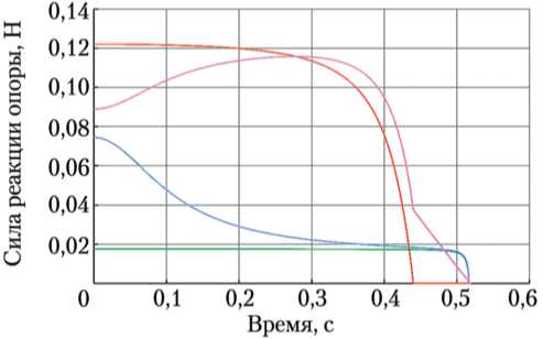 Рис. 5. Изменение сил реакции опоры наноспутника R 1 , R 2 , R 3 , R 4 при выходе из транспортно-пускового контейнера: — R 1 ; ^^^- — R 2 ; — R 3 ; — R 4 (рисунок создан авторами)