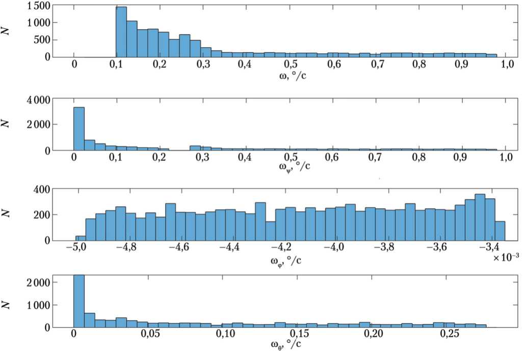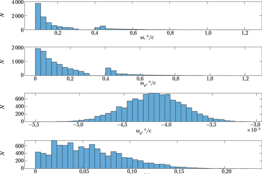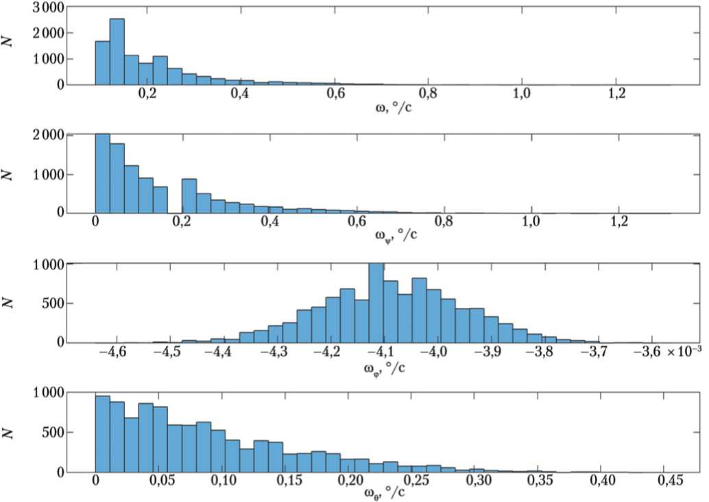 Таким образом, при параметрах НС, приведённых в табл. 2, и при условии, что СВ v 0 распределена по нормальному закону, МО абсолютной угловой скорости равно 0,22 ° /с, а СКО — 0,14 ° /с.
