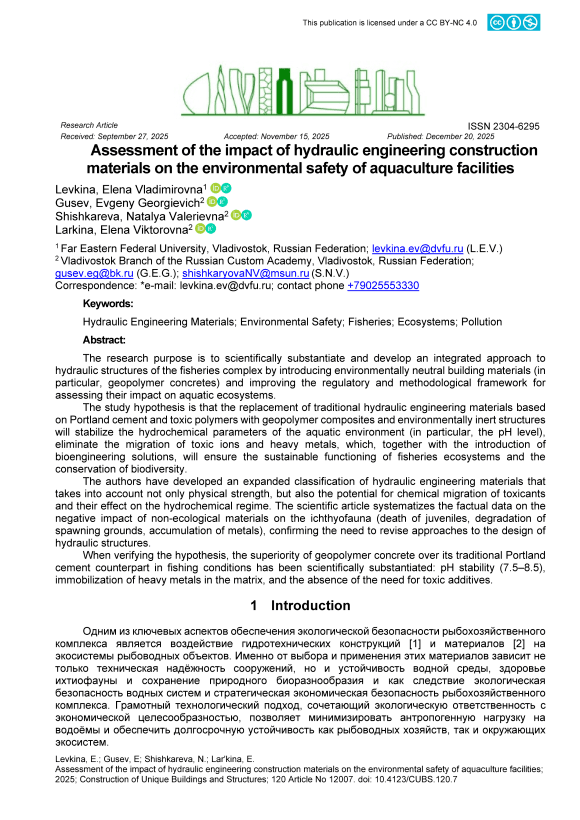 Цель исследования – научно обосновать и разработать комплексный подход к гидротехническим сооружениям рыбохозяйственного комплекса путем внедрения экологически нейтральных строительных материалов (в частности, геополимерных бетонов) и совершенствования нормативно-методологической базы для оценки их воздействия на водные экосистемы. Гипотеза исследования заключается в том, что замена традиционных гидротехнических материалов на основе портландцемента и токсичных полимеров на геополимерные композиты и экологически инертные конструкции стабилизирует гидрохимические параметры водной среды (в частности, уровень pH), устранит миграцию токсичных ионов и тяжелых металлов, что в сочетании с внедрением биоинженерных решений обеспечит устойчивое функционирование рыбохозяйственных экосистем и сохранение биоразнообразия. Авторы разработали расширенную классификацию гидротехнических материалов, учитывающую не только физическую прочность, но и потенциал химической миграции токсикантов и их влияние на гидрохимический режим. В научной статье систематизированы фактические данные о негативном воздействии неэкологичных материалов на ихтиофауну (гибель молоди, деградация нерестилищ, накопление металлов), подтверждающие необходимость пересмотра подходов к проектированию гидротехнических сооружений. При проверке гипотезы научно обосновано превосходство геополимерного бетона над его традиционным портландцементным аналогом в условиях рыболовства: стабильность pH (7,5–8,5), иммобилизация тяжелых металлов в матрице и отсутствие необходимости в токсичных добавках.
