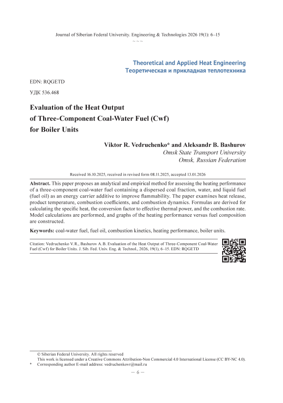 В работе предлагается аналитически- эмпирическая методика оценки жаропроизводительности трёхкомпонентного водоугольного топлива, содержащего угольную дисперсную фракцию, воду и жидкое топливо (мазут) в качестве энергоносителя-добавки для улучшения воспламеняемости. Рассматриваются зависимости тепловыделения, температура продуктов, коэффициенты сгорания и динамика горения. Получены формулы для расчёта удельной теплоты, коэффициента пересчёта на эффективную тепловую мощность и скорости горения. Проведены модельные расчёты и построены графики зависимости тепловой мощности от состава топлива.