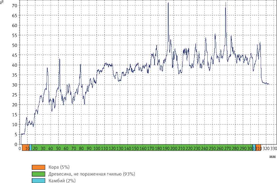 В рамках инструментальной оценки установлено, что в среднем на древесину приходится 93% диаметра ствола, а 7% на кору и камбий. Все образцы деревьев имеют древесину без скрытых стволовых гнилей и признаков патологий. На рис. 2 в качестве примера представлена диаграмма, сформированная программным
