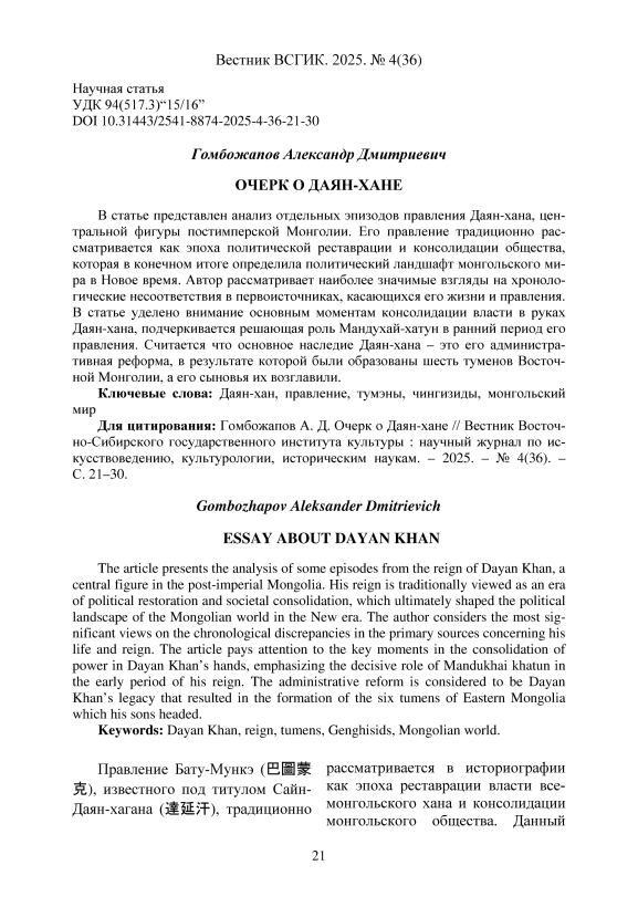 В статье представлен анализ отдельных эпизодов правления Даян-хана, центральной фигуры постимперской Монголии. Его правление традиционно рассматривается как эпоха политической реставрации и консолидации общества, которая в конечном итоге определила политический ландшафт монгольского мира в Новое время. Автор рассматривает наиболее значимые взгляды на хронологические несоответствия в первоисточниках, касающихся его жизни и правления. В статье уделено внимание основным моментам консолидации власти в руках Даян-хана, подчеркивается решающая роль Мандухай-хатун в ранний период его правления. Считается что основное наследие Даян-хана – это его административная реформа, в результате которой были образованы шесть туменов Восточной Монголии, а его сыновья их возглавили.