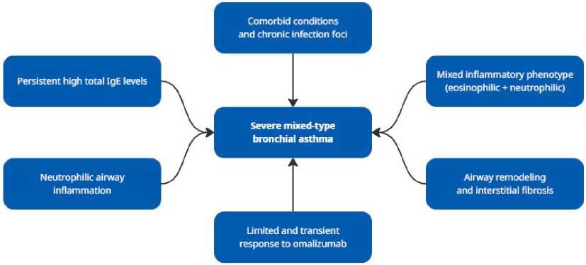 В статье представлен клинический случай пациентки 56 лет с тяжёлой неконтролируемой персистирующей бронхиальной астмой смешанного типа, характеризующейся недостаточным контролем заболевания, несмотря на проведение оптимизированной базисной и биологической терапии. Описана длительная история заболевания с прогрессированием симптомов, частыми обострениями, необходимостью системных глюкокортикостероидов и развитием дыхательной недостаточности I степени. Особое внимание уделено применению омализумаба как анти-IgE биологической терапии, назначенной в соответствии с уровнем общего IgE и массой тела пациентки. Несмотря на временное улучшение клинических показателей и баллов по опросникам контроля астмы, в дальнейшем отмечалась утрата терапевтического эффекта и возврат симптомов к исходному уровню. В статье представлены объективные данные, включая показатели функции внешнего дыхания, лабораторные маркеры аллергического и эозинофильного воспаления, результаты бронхоскопии, микроскопии мокроты и компьютерной томографии органов грудной клетки, подтверждающие хроническое воспаление и прогрессирующее фиброзное ремоделирование лёгочной ткани. Представленный случай подчёркивает гетерогенность бронхиальной астмы и ограничения анти-IgE терапии при смешанных и не-IgE-опосредованных фенотипах заболевания, а также необходимость персонализированного, фенотип-ориентированного подхода и динамического пересмотра терапевтической стратегии у пациентов с тяжёлым течением астмы.