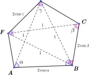 The pentagon in Fig. 1 b) with a = в = Y = arccos(1/4) is quite remarkable. Note that Z CEB = Z CFB = Z CAB = Z AFB = Z AEB = Z ACB = Z ECF = Z EBF = Z EAF = 2arcsin(1/4) = arccos(7/8) . In particular, all vertices of this pentagon lie on the same circle. This implies | AF | = | CE | = 3/4 . Moreover, | AC | = 7/8 . Note also that the radius of the circumscribed circle is л/17 /8 . Thus, if we increase this pentagon by 8 times, we get an integer pentagon , in which all sides and diagonals have integer lengths. This pentagon was found at first in [2], see also the discussion in [3, p. 19].