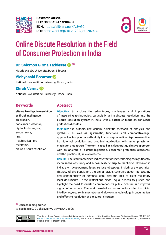 Objective: to explore the advantages, challenges and implications of integrating technologies, particularly online dispute resolution, into the dispute resolution system in India, with a particular focus on consumer protection disputes. Methods: the authors use general scientific methods of analysis and synthesis, as well as systematic, functional and comparative-legal approaches to systematically study the concept of online dispute resolution, its historical evolution and practical application with an emphasis on mediation procedures. The work is based on a doctrinal, qualitative approach with an analysis of current legislation, consumer protection standards, and the practice of judicial systems. Results: The results obtained indicate that online technologies significantly increase the efficiency and accessibility of dispute resolution. However, in India, their development faces serious obstacles, including the technical illiteracy of the population, the digital divide, concerns about the security and confidentiality of personal data, and the lack of clear regulatory legal documents. These restrictions hinder equal access to justice and highlight the need to develop comprehensive public policies and improve digital infrastructure. The work revealed a complementary role of artificial intelligence, electronic mediation and blockchain technology in ensuring fair and effective resolution of consumer disputes. Scientific novelty: it consists in a comprehensive review of the role of online dispute resolution within the Indian consumer protection system, taking into account modern technological transformations. The authors identify technological, legal and ethical issues that arise in this process and offer a vision of how digital transformation affects the administration of justice in the field of consumer protection. Practical significance: The study highlights the critical importance of strengthening digital infrastructure, increasing the level of digital and legal literacy of the population, and creating legislation to support the effective implementation of online dispute resolution in the Indian justice system. The work contains suggestions and recommendations for public and judicial authorities, technology developers and all stakeholders involved in the integration of digital tools into resolving consumer disputes, while ensuring fairness, inclusiveness and equal access for all participants in legal relations.