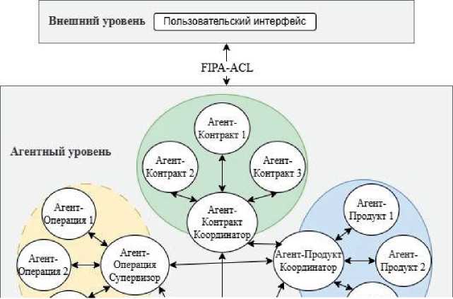 Исходя из данной схемы и параметров задачи ПР, предлагается использовать многоуровневую коалиционно-холоническую агентную архитектуру. Каждый холон представляет собой автономную группу агентов, которые могут использовать специализированные части общей онтологии для решения своих задач, координируясь общим агентом-супервизором, который отвечает за взаимодействие холона с другими холонами и коалициями. Такая структура позволяет раскрыть основные преимущества МАС: