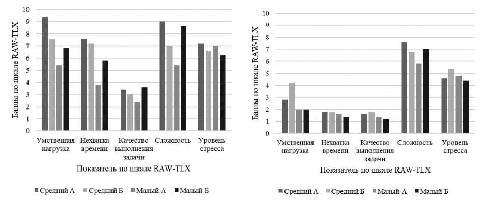 Помимо технической эффективности, в задаче снижения когнитивной нагрузки необходимо учитывать и оценку влияния МАС непосредственно на ЛПР. Для этого использовался метод субъективной оценки рабочей нагрузки NASA TLX, включающий набор шкал, по которым пользователь оценивает умственную и физическую нагрузки, нехватку времени, каче- ство выполнения задачи, сложность и уровень стресса [17]. Данный метод показал достаточную достоверность в исследованиях когнитивной нагрузки в сравнении с более глубокими тестами [18-20]. В данном тестировании использовалась его сокращённая версия RAW-TLX без физической нагрузки, где каждому из пяти факторов соответствовала десятибалльная шкала от «очень низкий» (1) до «очень высокий» (10) (кроме качества выполнения задачи, которое оценивается инвертированной шкалой), а итоговый индекс рассчитывался как среднее арифметическое всех параметров [21]. Опросник заполнялся участниками сразу после выполнения задания в каждом из режимов (см. рисунки 6 и 7).