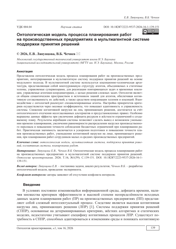 В условиях постоянно изменяющейся информационной среды, дефицита времени, наличия множества критериев эффективности и высокой степени неопределённости исходных данных задачи планирования работ (ПР) на производственных предприятиях (ПП) представляют собой сложный интеллектуальный процесс. Следствие является высокая когнитивная нагрузка лиц, принимающих решения (ЛПР) [1]. Системы поддержки принятия решений (СППР), основанные на детерминированных критериях, жёстких алгоритмах и статических моделях, недостаточно учитывают специфику когнитивных процессов ЛПР. Существует потребность в СППР, способных адаптироваться к изменениям среды и понижать когнитивную нагрузку на ЛПР. Применение онтологий позволяет формализовать знания о предметной области (ПрО), повысить гибкость и адаптивность управления, снизить когнитивную нагрузку на ЛПР, в т.ч. из-за схожести с ментальными моделями деятельности человека [2-4].