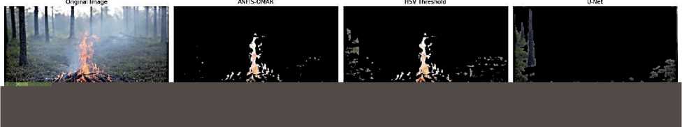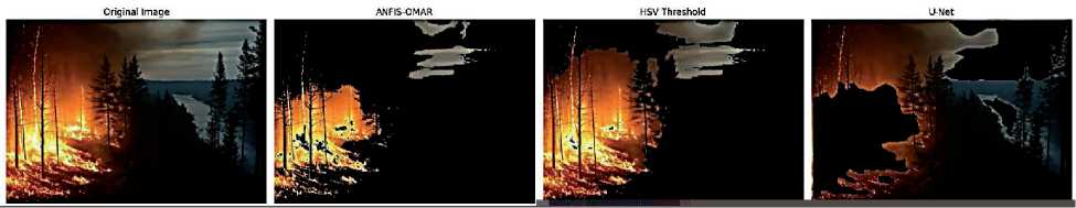 ANFIS-OMAR различал огонь и фон (дым, горы), минимизируя ложноположительные пиксели, в отличие от HSV , который чаще включал дым, и от U-Net , который переобучался. Время выполнения ANFIS-OMAR (~0.14–0.16 с) значительно ниже U-Net (~2.3–2.5 с), но больше HSV (~0.002–0.003 с). Это подтверждает пригодность ANFIS-OMAR для реального времени.
