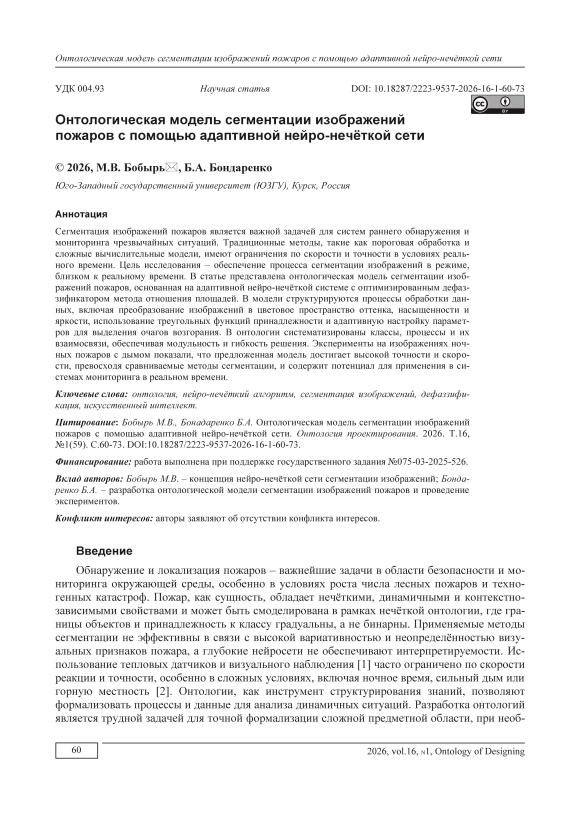 Обнаружение и локализация пожаров – важнейшие задачи в области безопасности и мониторинга окружающей среды, особенно в условиях роста числа лесных пожаров и техногенных катастроф. Пожар, как сущность, обладает нечёткими, динамичными и контекстнозависимыми свойствами и может быть смоделирована в рамках нечёткой онтологии, где границы объектов и принадлежность к классу градуальны, а не бинарны. Применяемые методы сегментации не эффективны в связи с высокой вариативностью и неопределённостью визуальных признаков пожара, а глубокие нейросети не обеспечивают интерпретируемости. Использование тепловых датчиков и визуального наблюдения [1] часто ограничено по скорости реакции и точности, особенно в сложных условиях, включая ночное время, сильный дым или горную местность [2]. Онтологии, как инструмент структурирования знаний, позволяют формализовать процессы и данные для анализа динамичных ситуаций. Разработка онтологий является трудной задачей для точной формализации сложной предметной области, при необ- ходимости адаптации к реальным условиям и нехватке стандартизированных инструментов для объединения онтологий с вычислительными системами. Это затрудняет их практическое применение в задачах мониторинга пожаров и делает актуальным продолжение исследований. Развитие методов обработки изображений позволяет автоматизировать процесс обнаружения очагов возгорания через сегментацию изображений, обеспечивая оперативное выделение зон огня даже при ограниченной видимости [3, 4].