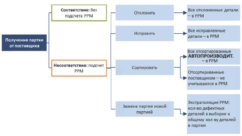 Количество бракованных деталей на миллион рассчитывается ежемесячно. Все детали и компоненты должны оцениваться на тех предприятиях/производственных площадках, где были выявлены отклонения [14, 15].