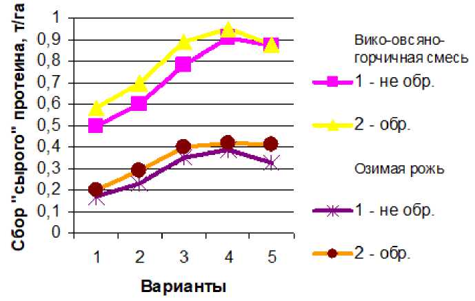 Сбор «сырого» протеина с урожаем при применении удобрений возрастал с 0,5 (контроль) до 0,9 т/га (расчётные системы удобрения) на вико-овсяно-горчичной смеси и в два раза - на озимой ржи (рисунок 2).
