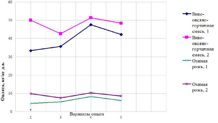 В опыте получена высокая оплата удобрений, которая составила 33,3-47,6 кг зеленой массы вико-овсяно-горчичной смеси без обработки препаратом и 42,7 – 51,4 кг/1 кг д.в. – при обработке препаратом. Оплата 1 кг действующего вещества удобрений в 4,53 - 8,15 кг зерна (превысив нормативную в 1,3 - 2,4 раза) отмечена на озимой ржи без применения препарата и в 7,46 – 10,24 кг на 1 кг д.в. – при применении препарата. Возрастающие дозы азотных удобрений обеспечили высокую оплату урожаем викоовсяной смеси, озимой ржи.