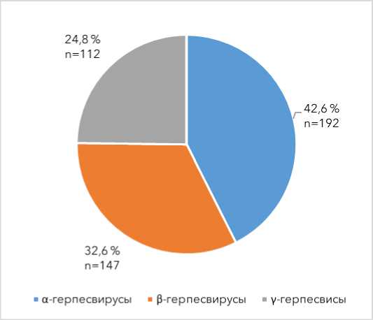 Рисунок 1. Структура герпесвирусов ( α -, β -, γ -) у пациентов с ГВИ Figure 1. Structure of herpes viruses ( α -, β -, γ -) in patients with HVI