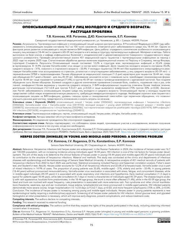 Актуальность. Герпесвирусные инфекции и опоясывающий лишай широко распространены. В Российской Федерации в 2024 году заболеваемость опоясывающим лишаем составила 16,7 на 100 тысяч населения, отмечается рост заболеваемости среди лиц 18–44 лет. Одним из факторов риска развития опоясывающего лишая является ВИЧ-инфекция. Цель работы: определить клинические особенности опоясывающего лишая у лиц молодого (18–44 лет) и среднего (45–59 лет) возраста и его вклад в структуру герпесвирусных инфекций. Материал и методы. Работа выполнена на базе клиник и кафедр инфекционных болезней с эпидемиологией и дерматовенерологии Самарского государственного медицинского университета. Проведён ретроспективный анализ 451 медицинской карты пациентов с герпесвирусными инфекциями за период с 2022 года по апрель 2025 года. Статистическая обработка данных включала корреляционный анализ по Пирсону и Спирмену, метод Фишера, t-критерий Стьюдента. Результаты. Опоясывающий лишай составляет 12,2% в структуре всех герпесвирусных инфекций и 22,6% среди α-герпесвирусов. В 14,9% случаев Varicella-zoster virus входит в состав микст-инфекций. Доля пациентов молодого возраста составила 35,6%, среднего возраста – 31%, пожилого и старческого возраста – 33,4%. У молодых пациентов (18–44 лет) без выраженного иммунодефицита реактивация Varicella-zoster virus ассоциирована со стрессом, усталостью и сопутствующими заболеваниями, у лиц среднего возраста (45–59 лет) – с перенесёнными ОРВИ и переохлаждением. Раннее обращение за медицинской помощью (1–3 дня) характерно для пациентов 18–44 лет, позднее обращение (4–7 дней и более) – для лиц 45–59 лет. Заболевание начинается остро с появления сыпи, преобладает локализованная форма. В группе 18–44 лет чаще поражается туловище (71,4%), в группе 45–59 лет голова и туловище вовлекаются с одинаковой частотой. При позднем обращении сыпь более обширная. Болевой синдром и другие клинические проявления (головная боль, слабость, поражение глаз и уха, отёк тканей, лимфаденит) более выражены у пациентов среднего возраста. У ВИЧ-инфицированных пациентов отмечены более тяжёлое течение, длительная госпитализация (12,1±2,8 дня против 9,3±2,1 дня, p=0,02) и чаще выявляется лимфопения (75% против 30%, p=0,04). Заключение. Растёт заболеваемость опоясывающим лишаем среди лиц молодого и среднего возраста. Опоясывающий герпес у молодых пациентов представляет собой новую эпидемиологическую реальность, требующую междисциплинарного подхода. Необходим скрининг всех пациентов с опоясывающим лишаем на ВИЧ-инфекцию, уровень глюкозы крови и гликированный гемоглобин при первичном обращении, что позволит улучшить раннюю диагностику, предотвратить осложнения и снизить затраты на лечение. Мы попытались создать так называемый наиболее типичный «портрет пациента с ОЛ без ВИЧинфекции», которому ещё нет 50 лет. Из-за малой выборки выявленные нами закономерности носят описательный характер. Это молодой работающий мужчина, возраст – 34,6±8,2 года, городской житель. При наличии метаболических нарушений и иммунной дисфункции он испытал стресс или переохладился. Заболевание у него будет протекать без осложнений, на фоне стандартной терапии он будет выписан через 7—9 дней. В общей структуре ГВИ 12,2% приходится на ОЛ, 22,6% – среди α- ГВ. В 14,9% случаев вирус HZV входит в состав микст-инфекций, что указывает на необходимость комплексной