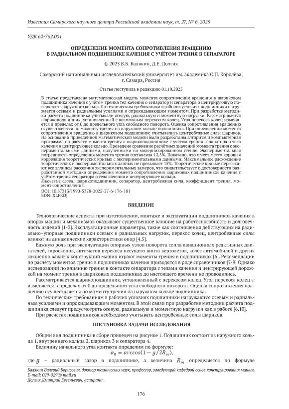 В статье представлена математическая модель момента сопротивления вращения в шариковом подшипника качения с учётом трения тел качения о сепаратор и сепаратора о центрирующую поверхность наружного кольца. По техническим требованиям в рабочих условиях подшипники нагружается осевым и радиальным усилиями и опрокидывающим моментом. При разработке методики расчета подшипника учитывали осевую, радиальную и моментную нагрузки. Рассматривается шарикоподшипник, установленный с возможным перекосом колец. Угол перекоса колец изменяется в пределах от 0 до предельного угла свободного поворота. Оценка сопротивления вращению осуществляется по моменту трения на наружном кольце подшипника. При определении момента сопротивления вращению в шариковом подшипнике учитывались центробежные силы шариков. На основании приведенной математической модели были разработаны алгоритм и компьютерная программа по расчёту момента трения в шарикоподшипнике с учётом трения сепаратора о тела качения и центрирующее кольцо. Проведено сравнение расчётных значений момента трения с экспериментальными данными, полученными на модернизированном стенде. Экспериментальная погрешность определения момента трения составляла 12,5%. Показано, что имеет место хорошая корреляция теоретических кривых с экспериментальными данными. Максимальное расхождение теоретических и экспериментальных данных не превышает 15%. Теоретические кривые пересекают все эллипсы рассеяния экспериментальных замеров, что свидетельствует о достоверности разработанной методики определения момента сопротивления шариковых подшипников качения с учётом трения сепаратора о тела качения и центрирующее кольцо.